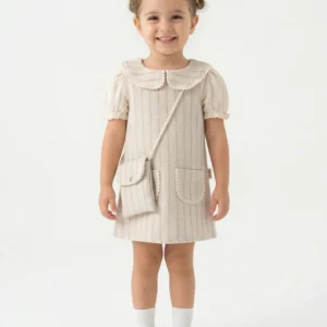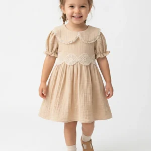 Kız Bebek Güpürlü Düğme Detaylı Keten Yaka Müslin Elbise