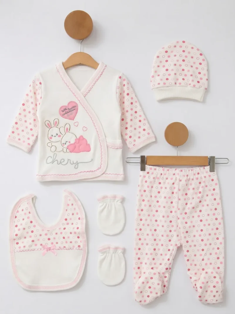 Kız Bebek Tavşanlı Puantiyeli Pembe 5li Hastane Çıkışı