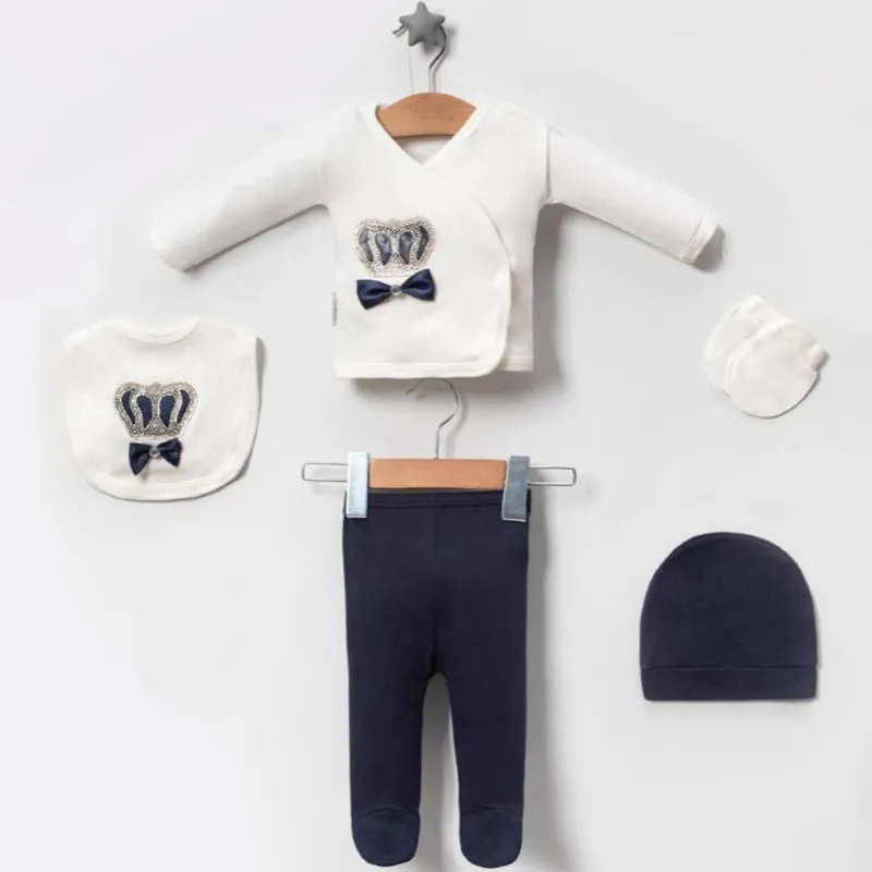 Yenidoğan Erkek Bebek Taçlı Pamuklu 5’li Hastane Çıkışı